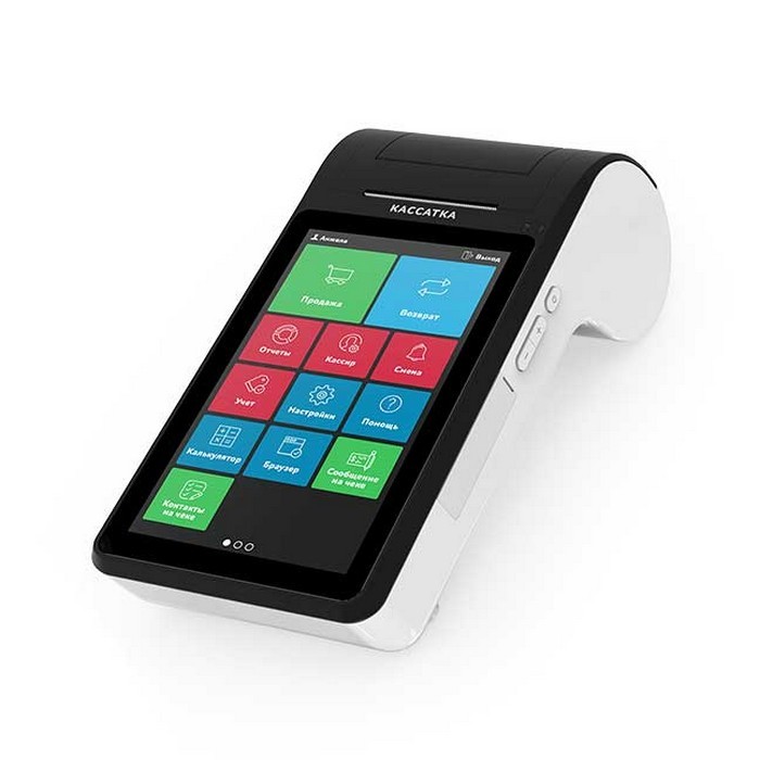 Кассатка-1Ф – мобильный смарт-терминал с встроенным аккумулятором, удобство управления обеспечат 7-дюймовый сенсорный экран с установленной ОС Android. За счет малого веса, компактных габаритов и встроенного датчика бесконтактной оплаты, востребован в сфере курьерской доставки и выездной торговли. Встроенный принтер печатает со скоростью 18 строк/сек., работает с термолентой шриной 57мм. В смарт-терминал Кассатка-1Ф, встроены все необходимые порты для подключения дополнительного оборудования.